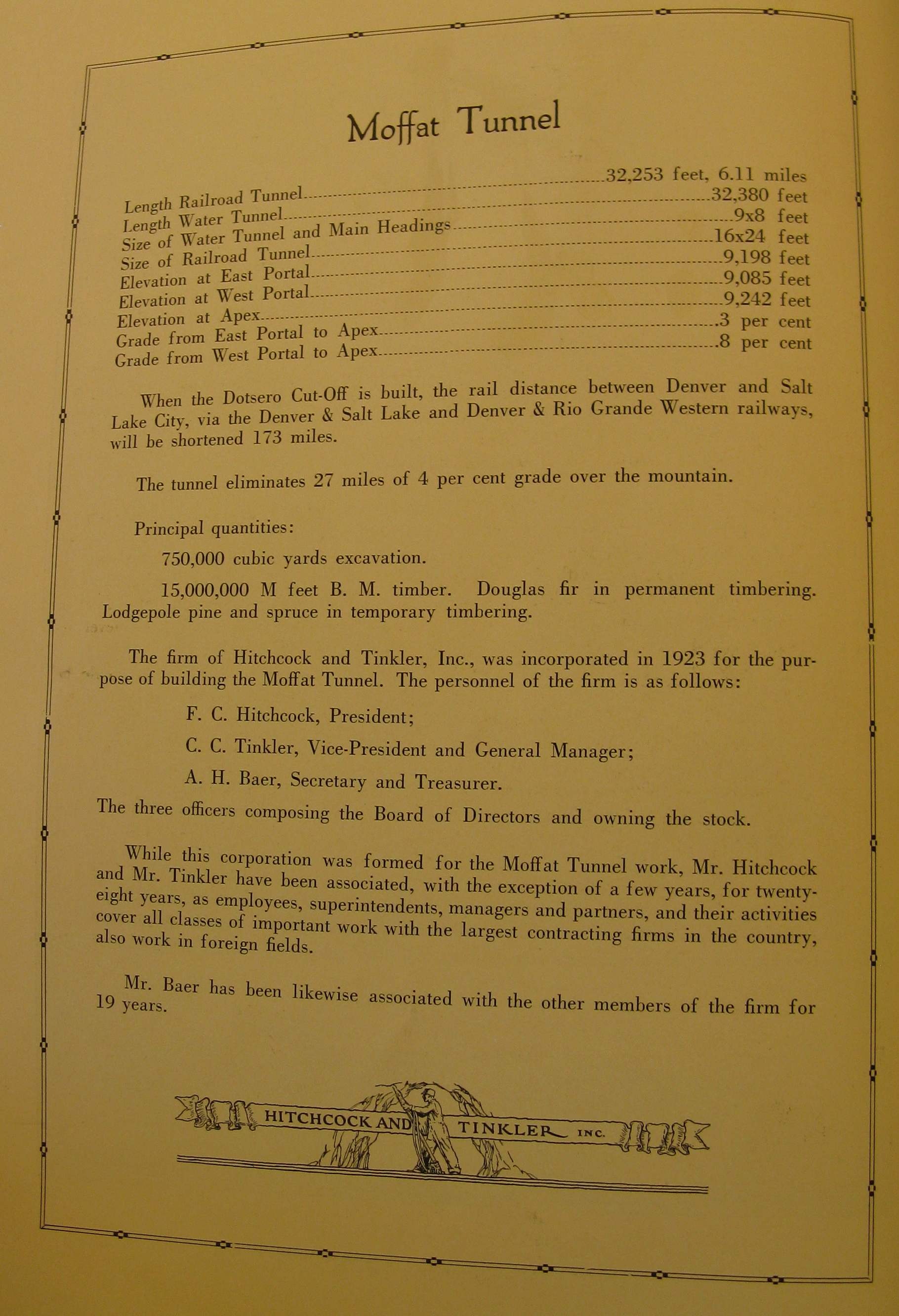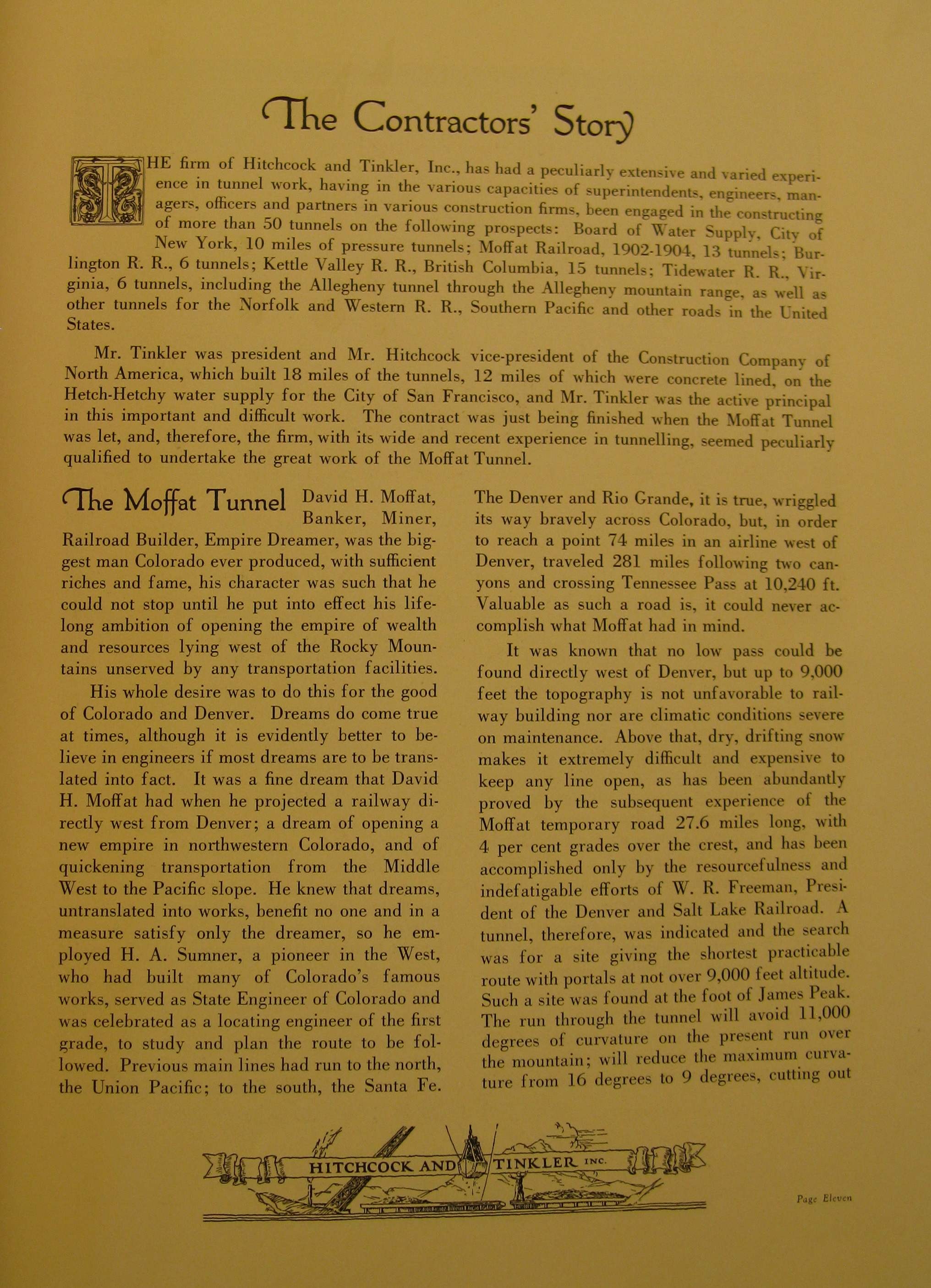 This is the Contractor's Story of the Moffat Tunnel in Northwest Colorado. Photos from the original document held at Bud Werner Memorial Library in Steamboat Springs CO.